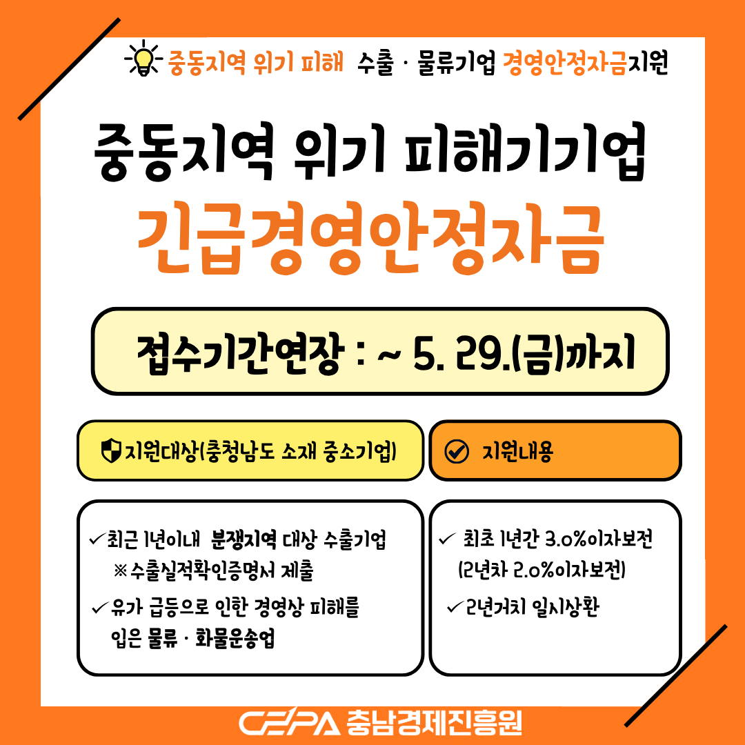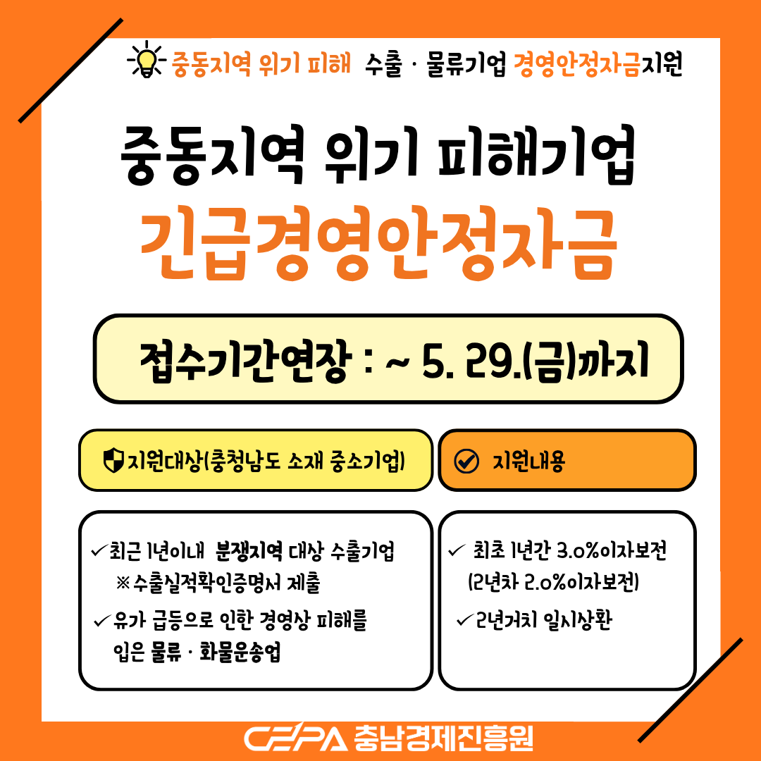 [접수일정]중동지역 위기 피해 기업 경영안정자금 지원계획 공고(연장)